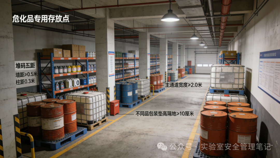 在危化品的专用存放点,空间规划十分严格。物品必须按 “堆码五距” 的原则放置: