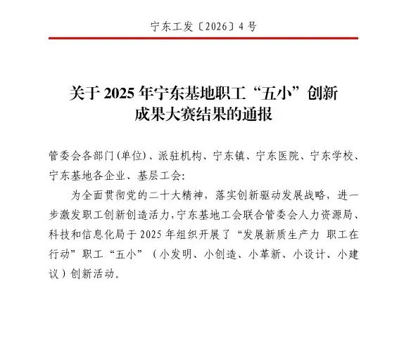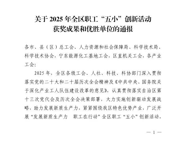 为全面贯彻党的二十大精神,根据自治区总工会、人力资源和社会保障厅、科学技术厅和科学技术协会《关于开展“发展新质生产力职工在行动”2025年全区职工“五小”创新活动的通知》要求,宁东基地工会携手人力资源局、科技和信息化局,积极组织开展职工“五小”(小发明、小创造、小革新、小设计、小建议)创新活动。活动开展以来,广大职工踊跃参与、岗位建功,涌现出一批源于生产一线、破解实际难题、创造显著效益的优秀成果。目前,自治区总工会公布“五小”创新活动获奖名单,宁东基地多家企业荣登榜单,再创佳绩。