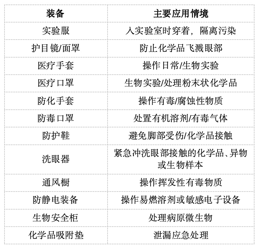 ①佩戴适当的个人防护装备(实验服、手套、护目镜/面罩、防毒面具等)。