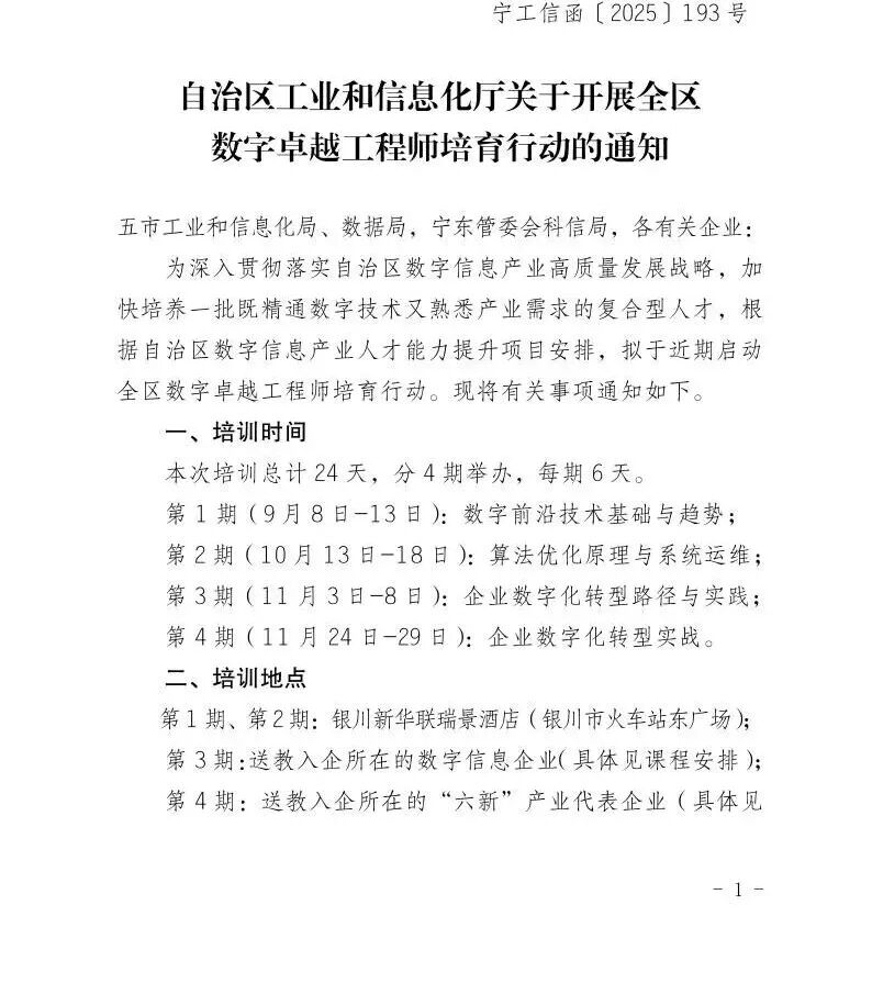根据《自治区工业和信息化厅关于开展全区数字卓越工程师培育行动的通知》,将于近日举办全区数字卓越工程师培育行动第二期,具体事宜安排如下: